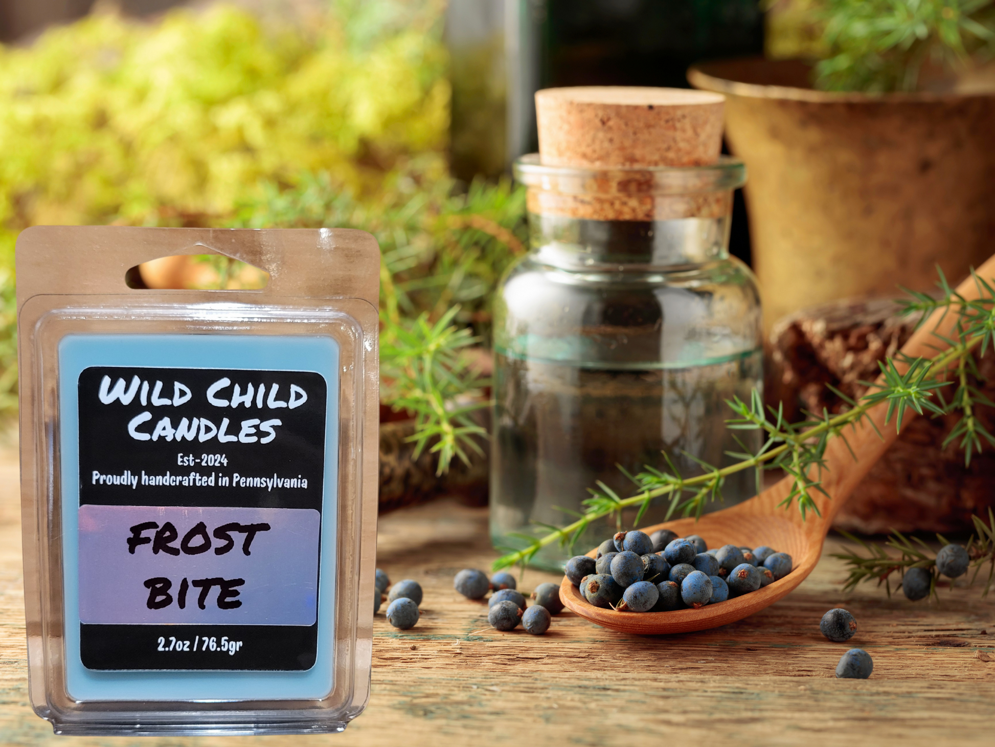 Enjoy the wintery outdoor scent of juniper with the Frost Bite wax melt from Wild Child Candles. This soothing scent will indulge your senses and get you in the holiday spirit.