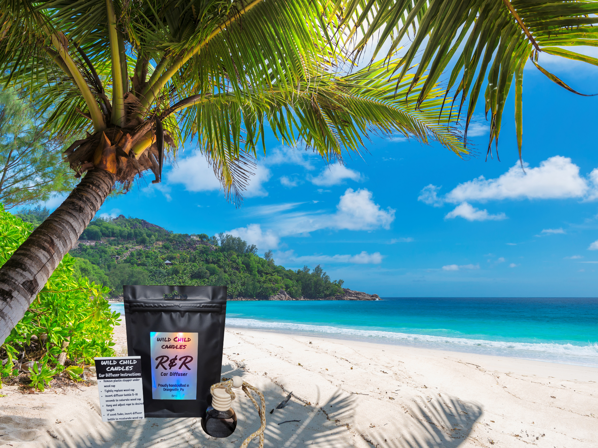 Enjoy the scent of a tropical rainforest with the R&R Csr Diffuser from Wild Child Candles. This lush tropical scent has top notes of jungle mist, lemon flower, and coconut with middle notes of orchid, tahitian gardenia, and lily, with a solid base of palm, sandalwood, and musk. Bring the tropics into your car with this captivating scent. Simply unscrew the wood cap, carefully remove the plastic stopper, replace the wood cap tightly, and invert to moisten the wood cap and release the scent. When your scent starts to fade, simply invert the bottle again to resaturate. Unlike typical car fresheners, car diffusers give you complete control over how strong or how light you prefer your scents.