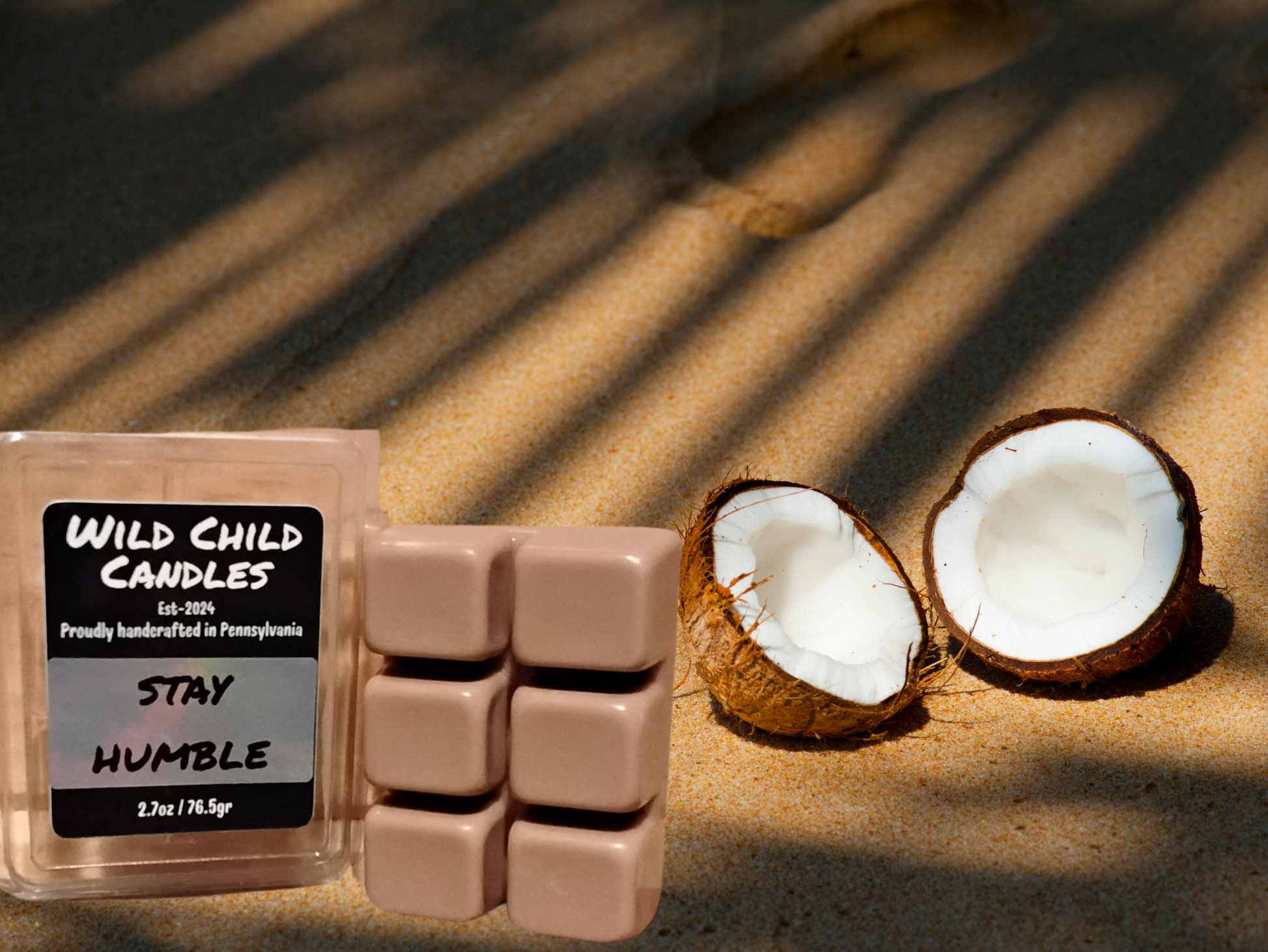 Indulge in the calming scent of coconut with the Stay Humble wax melt from Wild Child Candles. Elevate your space with this aromatic and luxurious addition.